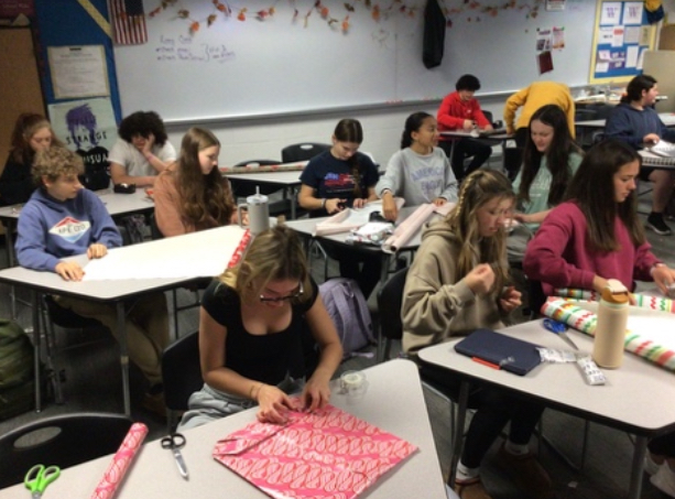Every year, Volunteers in Paupack hosts Santa’s Workshop, an event during the school day in which students can pick out items and have them wrapped for gifts. Every item is donated from our community and completely free! Behind the scenes, hundreds of bags of all different sizes have to be wrapped and ready for the workshop. Mrs. Fehringer and her freshman seminar classes stepped up to the task. In total, they were able to make 500-600 bags! Additionally, students were able to gain experience in the art of crafting bags and had lots of fun doing so.
